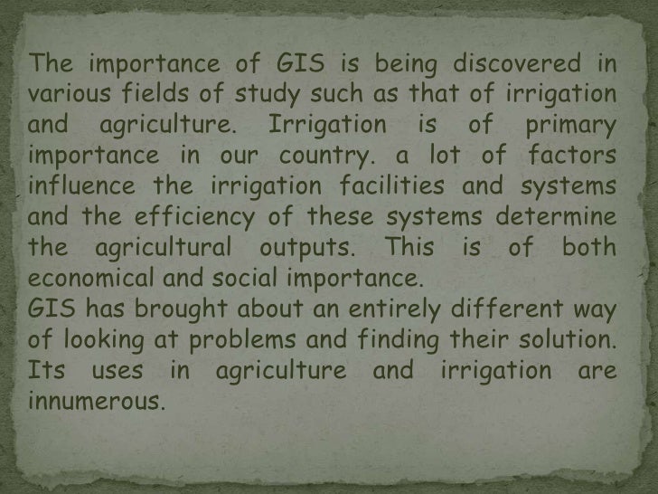 Application of GIS in agriculture from image.slidesharecdn.com Using gis, the farmer can determine where rain water is draining too quickly or too slowly so that either engineering steps can be taken to reroute its flow, or chemicals can be applied to improve the internal drainage of the soil. Geographic and geologic features of current (and potential) farmland scientists and farmers can work together to create more effective and efficient farming techniques; Mapping soil properties chemical application chemical prescriptions slideshow 397909.